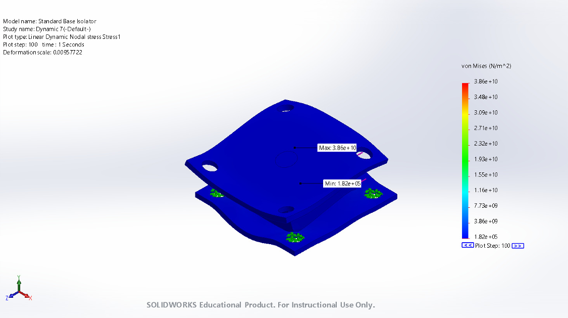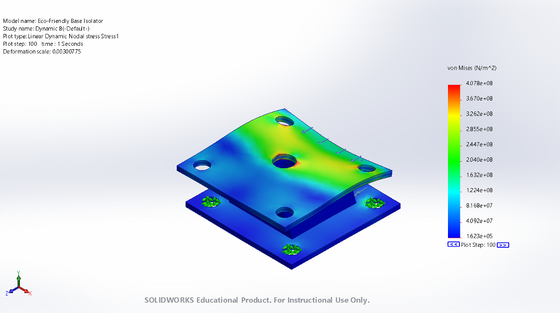 While Eco-Friendly Base Isolators are promising in their effectiveness, they underperform their counterparts. STRPS have lower stiffness under both axial and shear loading. From Graph 1, the stiffness of the STRPS model drops significantly faster as the thickness of the rubber layers increases compared to the Standard model. Von Mises Stress Concentration illustrates that the maximum stress element for the Standard model is 3.86e+10N/m^2 while STRPS yields 4.078e+08N/m^2. Additionally, the max frequency in Hz for the Eco model was 0.78773 and 1.2707 for the Standard model, given a 38% difference. The stress concentration at the holes in the concrete plates for both models came up to be 2.00e+9N/^2, which is a larger max value for the Eco model but lower for the Standard model, indicating that the chosen size should have been larger. Standard Base Isolators are 94x more effective at absorbing stress concentration than STRPS. Some explanations for such differences could be explained by the fact that the Standard model has a concrete lead in the center that absorbs most of the axial loading, in addition, there are steel reinforcement plates distributed in between rubber layers that also act as reinforcement for axial loading that STRPS models miss. While the Eco model yields worse results than the Standard model by overcoming several issues in the design, such as adding a lead core and reinforming plates, it could result in better performance and thus wider implementation specifically for buildings of medium size. Thus, more analysis needs to be performed.